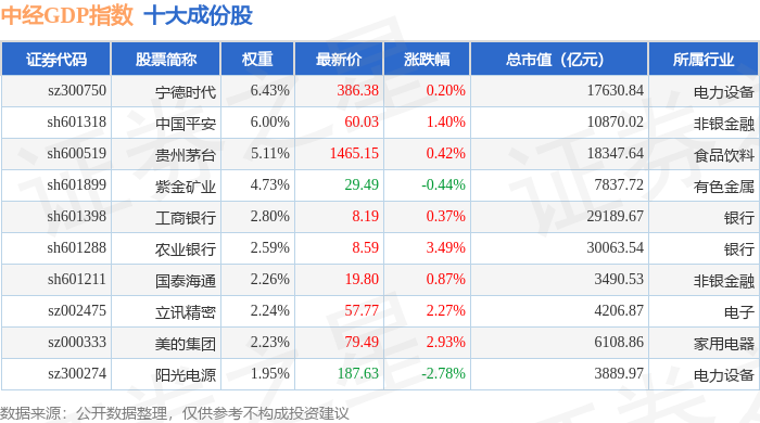 证券之星消息,11月12日,中经GDP(399399)指数报收于8318.34点,跌0.16%,成交3029.98亿元,换手率0.72%。当日该指数成份股中,上涨的有109家,南京新百以10.0%的涨幅领涨,下跌的有184家,阿特斯以14.33%的跌幅领跌。