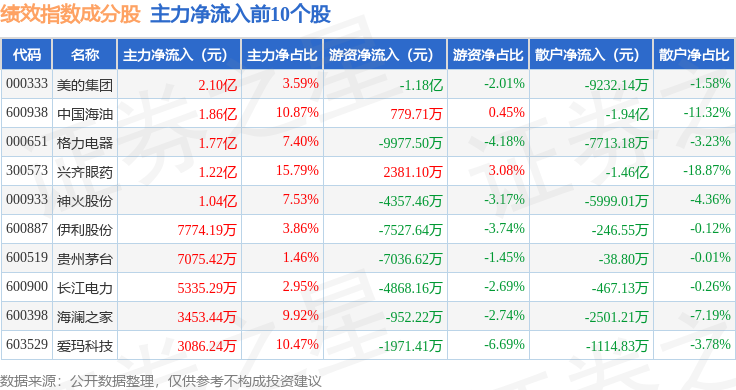 资金流向方面,绩效指数(399398)成份股当日主力资金净流出合计17.02亿元,游资资金净流入合计4.7亿元,散户资金净流入合计12.31亿元。成份股资金流向详情见下表: