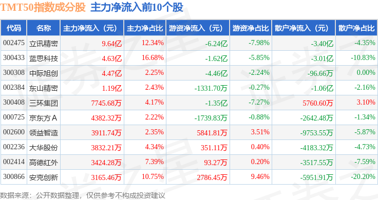 资金流向方面,TMT50(399610)指数成份股当日主力资金净流出合计43.33亿元,游资资金净流出合计7.06亿元,散户资金净流入合计50.39亿元。成份股资金流向详情见下表: