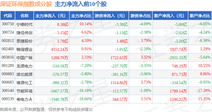 资金流向方面,深证环保(399638)指数成份股当日主力资金净流出合计51.11亿元,游资资金净流入合计13.72亿元,散户资金净流入合计37.39亿元。成份股资金流向详情见下表: