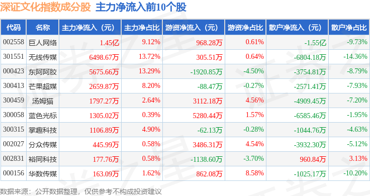 资金流向方面,深证文化(399654)指数成份股当日主力资金净流出合计30.7亿元,游资资金净流入合计10.26亿元,散户资金净流入合计20.44亿元。成份股资金流向详情见下表: