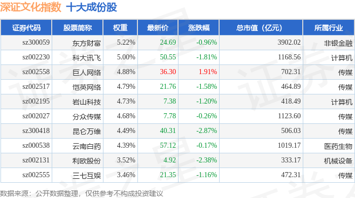 证券之星消息,11月12日,深证文化(399654)指数报收于2829.51点,跌0.89%,成交353.74亿元,换手率2.74%。当日该指数成份股中,上涨的有10家,无线传媒以3.16%的涨幅领涨,下跌的有38家,每日互动以6.24%的跌幅领跌。