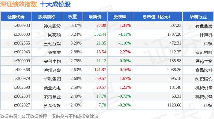 深证绩效(399655)指数十大成份股详情如下: