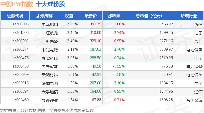 证券之星消息,11月12日,中创EW(399660)指数报收于2720.3点,跌0.54%,成交2163.91亿元,换手率1.48%。当日该指数成份股中,上涨的有34家,中际旭创以5.06%的涨幅领涨,下跌的有64家,晶盛机电以7.23%的跌幅领跌。