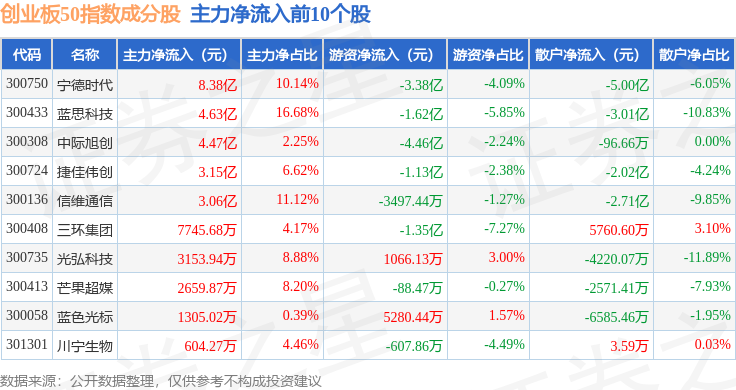 资金流向方面,创业板50(399673)指数成份股当日主力资金净流出合计55.98亿元,游资资金净流入合计4.86亿元,散户资金净流入合计51.12亿元。成份股资金流向详情见下表: