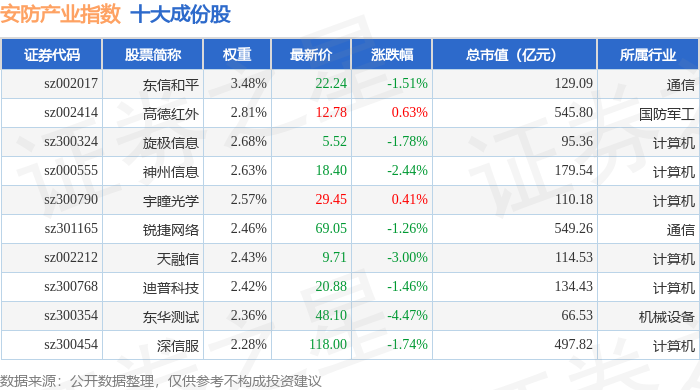 安防产业(399693)指数十大成份股详情如下: