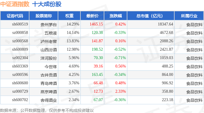 中证酒(399987)指数十大成份股详情如下: