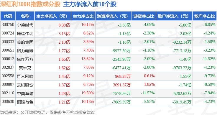 资金流向方面,深红利300R(470062)指数成份股当日主力资金净流出合计54.13亿元,游资资金净流入合计5.18亿元,散户资金净流入合计48.95亿元。成份股资金流向详情见下表: