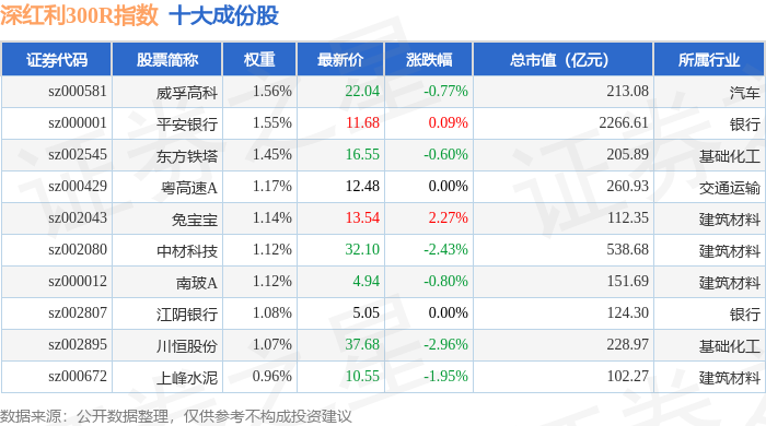 证券之星消息,11月12日,深红利300R(470062)指数报收于8304.33点,跌0.4%,成交1804.58亿元,换手率1.86%。当日该指数成份股中,上涨的有91家,中国海诚以9.98%的涨幅领涨,下跌的有202家,晶盛机电以7.23%的跌幅领跌。