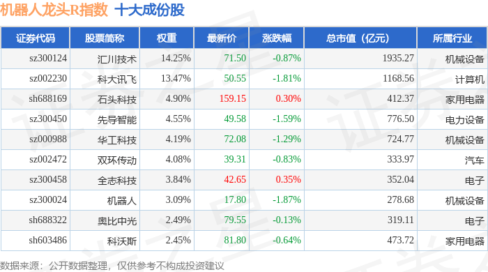 证券之星消息,11月12日,机器人龙头R(480071)指数报收于2566.1点,跌1.01%,成交285.0亿元,换手率2.25%。当日该指数成份股中,上涨的有7家,航天智装以16.57%的涨幅领涨,下跌的有43家,东方精工以3.65%的跌幅领跌。