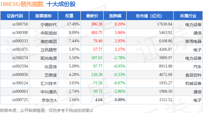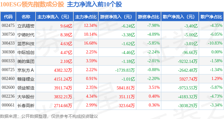 资金流向方面,100ESG领先(970030)指数成份股当日主力资金净流出合计24.02亿元,游资资金净流出合计2.72亿元,散户资金净流入合计26.73亿元。成份股资金流向详情见下表: