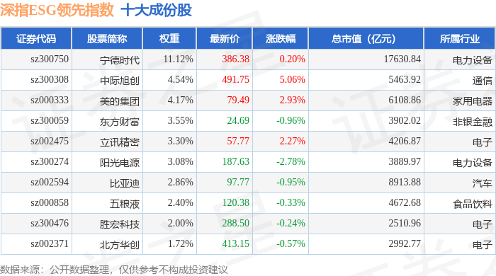 证券之星消息,11月12日,深指ESG领先(970029)指数报收于14180.89点,跌0.32%,成交2606.39亿元,换手率1.68%。当日该指数成份股中,上涨的有56家,协鑫集成以5.74%的涨幅领涨,下跌的有140家,兴森科技以8.02%的跌幅领跌。