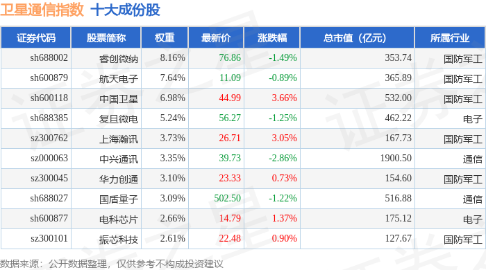 卫星通信(980018)指数十大成份股详情如下:
