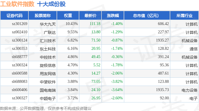 证券之星消息,11月12日,工业软件(980034)指数报收于3190.93点,跌1.4%,成交219.29亿元,换手率2.2%。当日该指数成份股中,上涨的有6家,航天智装以16.57%的涨幅领涨,下跌的有43家,国电南自以5.32%的跌幅领跌。
