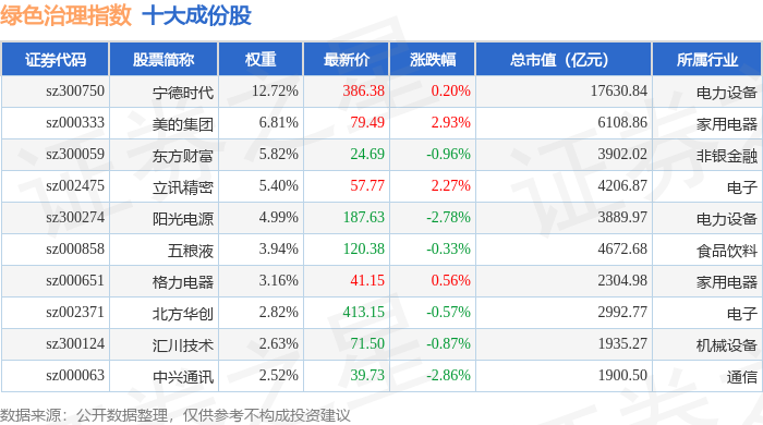 资金流向方面,绿色治理(980058)指数成份股当日主力资金净流出合计39.86亿元,游资资金净流入合计5.83亿元,散户资金净流入合计34.03亿元。成份股资金流向详情见下表: