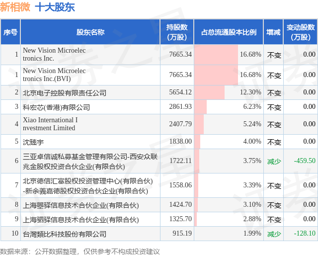 证券之星消息,11月12日新相微发布公告《新相微:新相微持股5%以上股东减持股份结果公告》,其股东科宏芯(香港)有限公司于2025年11月5日至2025年11月12日间合计减持354.77万股,占公司目前总股本的0.772%,变动期间该股股价上涨14.36%,截止11月12日收盘报24.77元。
