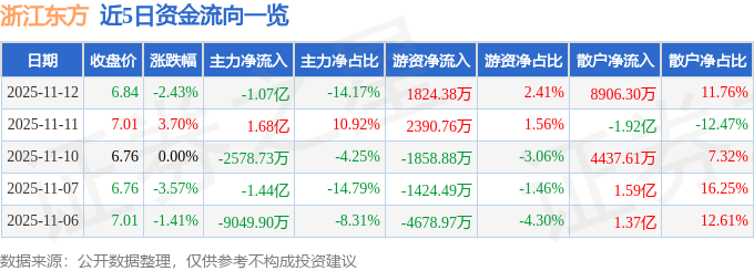 证券之星消息,截至2025年11月12日收盘,浙江东方(600120)报收于6.84元,下跌2.43%,换手率3.23%,成交量110.42万手,成交额7.57亿元。