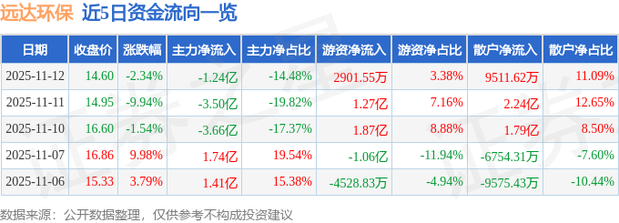 证券之星消息,截至2025年11月12日收盘,远达环保(600292)报收于14.6元,下跌2.34%,换手率7.54%,成交量58.9万手,成交额8.57亿元。