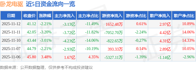 证券之星消息,截至2025年11月12日收盘,卧龙电驱(600580)报收于41.12元,下跌2.21%,换手率4.22%,成交量65.85万手,成交额27.26亿元。