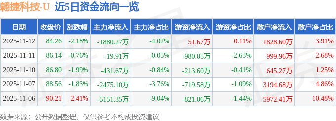 11月12日的资金流向数据方面,主力资金净流出1880.27万元,占总成交额4.02%,游资资金净流入51.67万元,占总成交额0.11%,散户资金净流入1828.6万元,占总成交额3.91%。