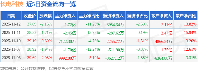 11月12日的资金流向数据方面,主力资金净流出1.72亿元,占总成交额11.23%,游资资金净流出3954.34万元,占总成交额2.59%,散户资金净流入2.11亿元,占总成交额13.82%。