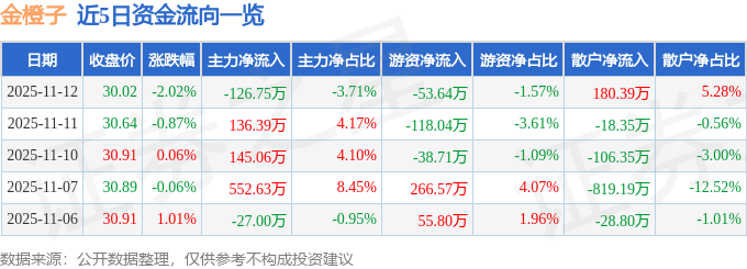 证券之星消息,截至2025年11月12日收盘,金橙子(688291)报收于30.02元,下跌2.02%,换手率1.1%,成交量1.13万手,成交额3416.59万元。