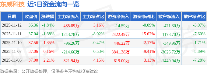 证券之星消息,截至2025年11月12日收盘,东威科技(688700)报收于36.36元,下跌1.84%,换手率1.42%,成交量4.23万手,成交额1.54亿元。