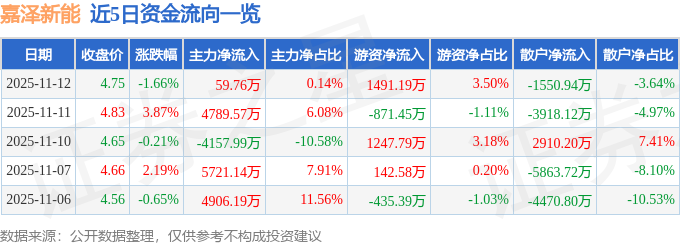 证券之星消息,截至2025年11月12日收盘,嘉泽新能(601619)报收于4.75元,下跌1.66%,换手率3.67%,成交量89.41万手,成交额4.26亿元。