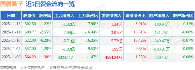 证券之星消息,截至2025年11月12日收盘,国盾量子(688027)报收于502.5元,下跌1.22%,换手率4.15%,成交量3.33万手,成交额16.76亿元。