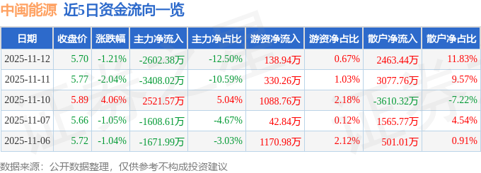 证券之星消息,截至2025年11月12日收盘,中闽能源(600163)报收于5.7元,下跌1.21%,换手率1.92%,成交量36.58万手,成交额2.08亿元。