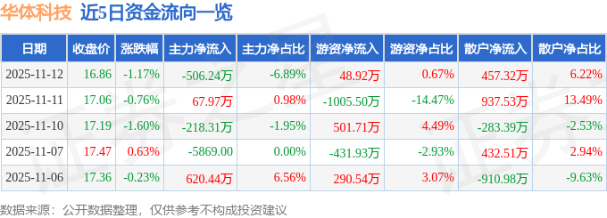 证券之星消息,截至2025年11月12日收盘,华体科技(603679)报收于16.86元,下跌1.17%,换手率2.66%,成交量4.39万手,成交额7351.29万元。