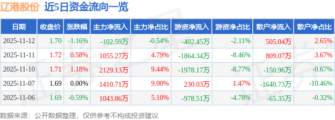 证券之星消息,截至2025年11月12日收盘,辽港股份(601880)报收于1.7元,下跌1.16%,换手率0.61%,成交量111.74万手,成交额1.9亿元。