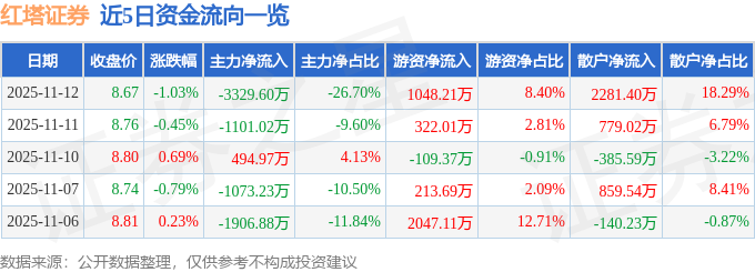证券之星消息,截至2025年11月12日收盘,红塔证券(601236)报收于8.67元,下跌1.03%,换手率0.3%,成交量14.35万手,成交额1.25亿元。