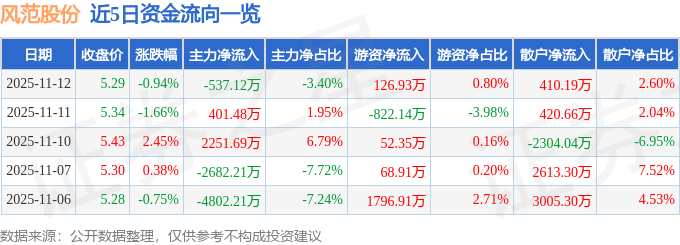 证券之星消息,截至2025年11月12日收盘,风范股份(601700)报收于5.29元,下跌0.94%,换手率2.6%,成交量29.75万手,成交额1.58亿元。