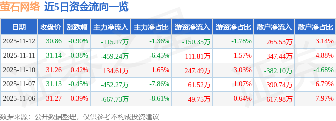 证券之星消息,截至2025年11月12日收盘,萤石网络(688475)报收于30.86元,下跌0.9%,换手率0.67%,成交量2.73万手,成交额8460.16万元。
