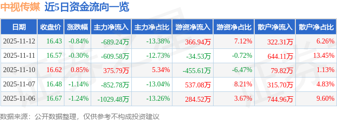 证券之星消息,截至2025年11月12日收盘,中视传媒(600088)报收于16.43元,下跌0.84%,换手率0.79%,成交量3.14万手,成交额5151.87万元。