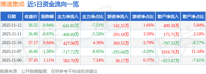 11月12日的资金流向数据方面,主力资金净流出641.81万元,占总成交额7.51%,游资资金净流入142.31万元,占总成交额1.66%,散户资金净流入499.5万元,占总成交额5.84%。