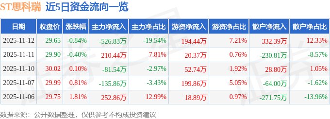 11月12日的资金流向数据方面,主力资金净流出526.83万元,占总成交额19.54%,游资资金净流入194.44万元,占总成交额7.21%,散户资金净流入332.39万元,占总成交额12.33%。