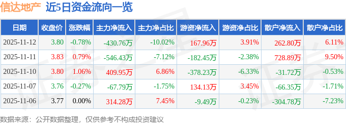 证券之星消息,截至2025年11月12日收盘,信达地产(600657)报收于3.8元,下跌0.78%,换手率0.4%,成交量11.33万手,成交额4300.33万元。