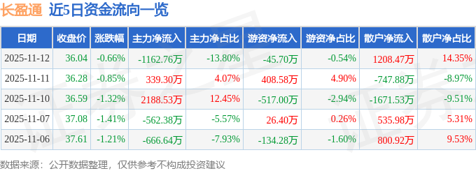 证券之星消息,截至2025年11月12日收盘,长盈通(688143)报收于36.04元,下跌0.66%,换手率2.49%,成交量2.35万手,成交额8422.82万元。