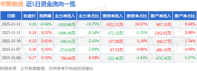 证券之星消息,截至2025年11月12日收盘,华贸物流(603128)报收于6.2元,下跌0.64%,换手率1.28%,成交量16.82万手,成交额1.05亿元。