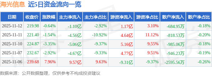 证券之星消息,截至2025年11月12日收盘,海光信息(688041)报收于219.98元,下跌0.64%,换手率0.74%,成交量17.24万手,成交额37.74亿元。