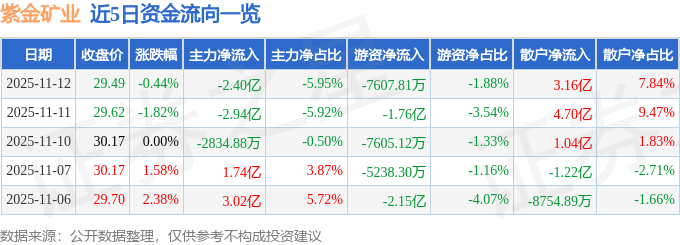 证券之星消息,截至2025年11月12日收盘,紫金矿业(601899)报收于29.49元,下跌0.44%,换手率0.66%,成交量136.43万手,成交额40.37亿元。