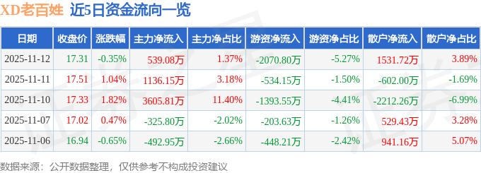 11月12日的资金流向数据方面,主力资金净流入539.08万元,占总成交额1.37%,游资资金净流出2070.8万元,占总成交额5.27%,散户资金净流入1531.72万元,占总成交额3.89%。