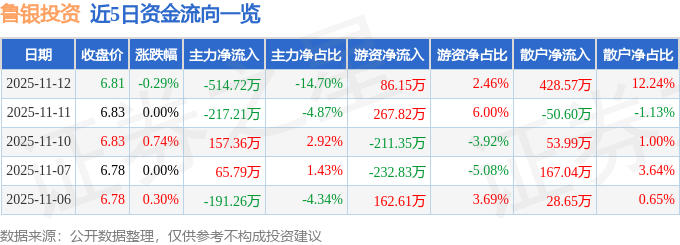 证券之星消息,截至2025年11月12日收盘,鲁银投资(600784)报收于6.81元,下跌0.29%,换手率0.76%,成交量5.14万手,成交额3500.93万元。