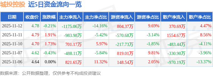 证券之星消息,截至2025年11月12日收盘,城投控股(600649)报收于4.78元,下跌0.21%,换手率0.69%,成交量17.39万手,成交额8297.27万元。