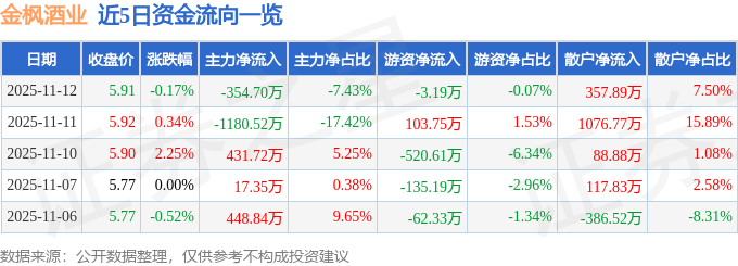 证券之星消息,截至2025年11月12日收盘,金枫酒业(600616)报收于5.91元,下跌0.17%,换手率1.21%,成交量8.07万手,成交额4771.82万元。