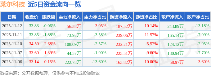 证券之星消息,截至2025年11月12日收盘,莱尔科技(688683)报收于33.83元,下跌0.06%,换手率0.35%,成交量5489.0手,成交额1850.09万元。
