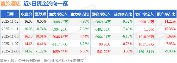 证券之星消息,截至2025年11月12日收盘,首旅酒店(600258)报收于16.03元,上涨0.0%,换手率3.46%,成交量38.67万手,成交额6.3亿元。