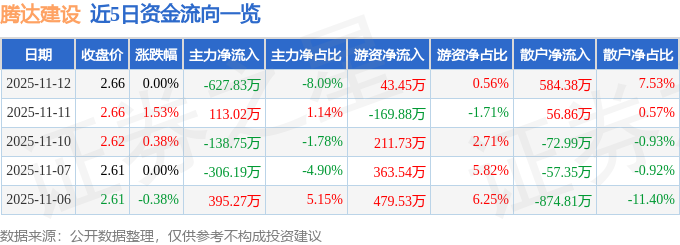 证券之星消息,截至2025年11月12日收盘,腾达建设(600512)报收于2.66元,上涨0.0%,换手率1.85%,成交量29.29万手,成交额7760.18万元。